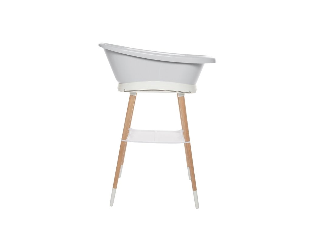 Velmi stabilní vanový stojan Sense má nohy vyrobené z lakovaného bukového dřeva s certifikací FSC. To dodává stojanu teplý moderní vzhled. Je vybaven praktickými pomůckami; vpředu je připevněn držák na ručníky. Prostorná plastová polička poskytuje dostatek místa například pro šampon, žínku, vodní hračky nebo koupací gel. To znamená, že máte po ruce všechny potřebné věci, abyste si s malým mohli v klidu koupání užít. Inovativní systém upevnění zajišťuje, že vanu lze snadno připevnit ke stojanu a stejně snadno sejmout. Po kliknutí můžete své miminko nerušeně a bezpečně koupat.