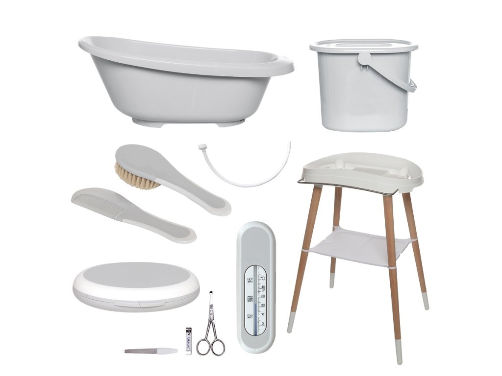 Sada obsahuje: vaničku Sense a luxusní stojan z lakovaného buku, kyblík na plenky,  sadu na manikúru, hřeben a kartáč, teploměr do vaničky a vypouštěcí hadici. Zkrátka vaše kompletní vybavení pro péči a koupání!