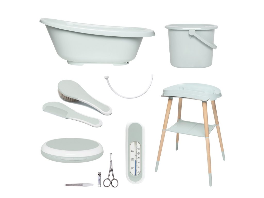 Sada obsahuje: vaničku Sense a luxusní stojan z lakovaného buku, kyblík na plenky, sadu na manikúru, hřeben a kartáč, teploměr do vaničky a vypouštěcí hadici. Zkrátka vaše kompletní vybavení pro péči a koupání!