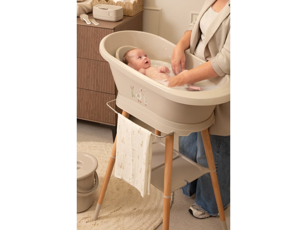 Velmi stabilní vanový stojan Sense má nohy vyrobené z lakovaného bukového dřeva s certifikací FSC. To dodává stojanu teplý moderní vzhled. Je vybaven praktickými pomůckami; vpředu je připevněn držák na ručníky. Prostorná plastová polička poskytuje dostatek místa například pro šampon, žínku, vodní hračky nebo koupací gel. To znamená, že máte po ruce všechny potřebné věci, abyste si s malým mohli v klidu koupání užít. Inovativní systém upevnění zajišťuje, že vanu lze snadno připevnit ke stojanu a stejně snadno sejmout. Po kliknutí můžete své miminko nerušeně a bezpečně koupat.
