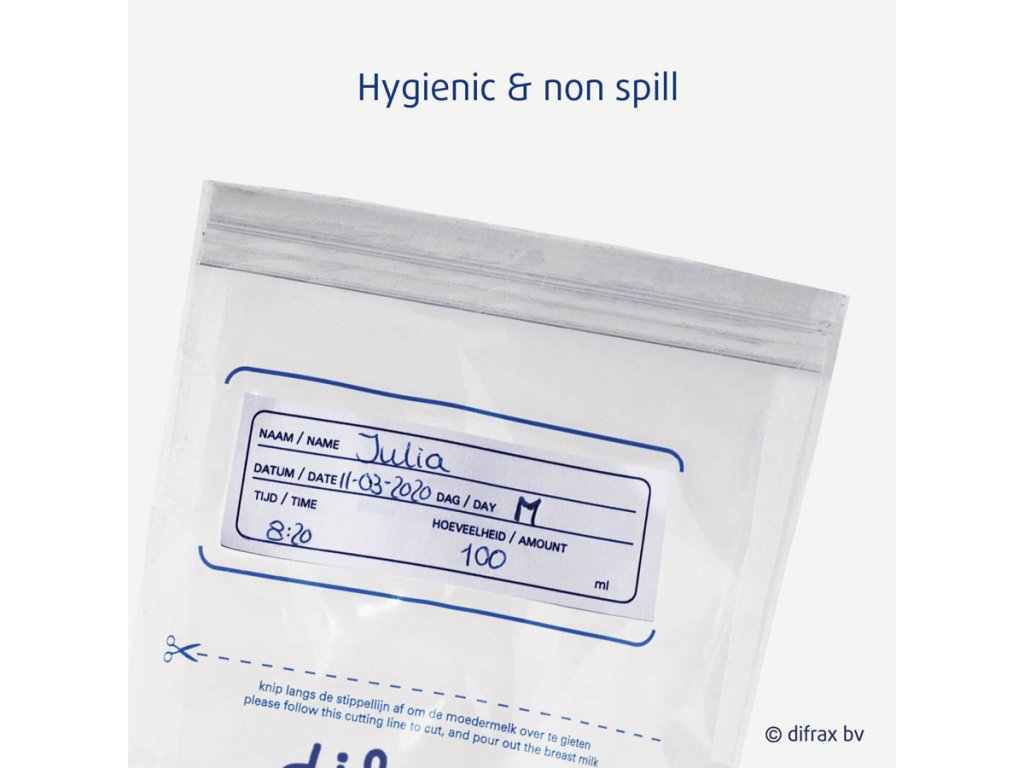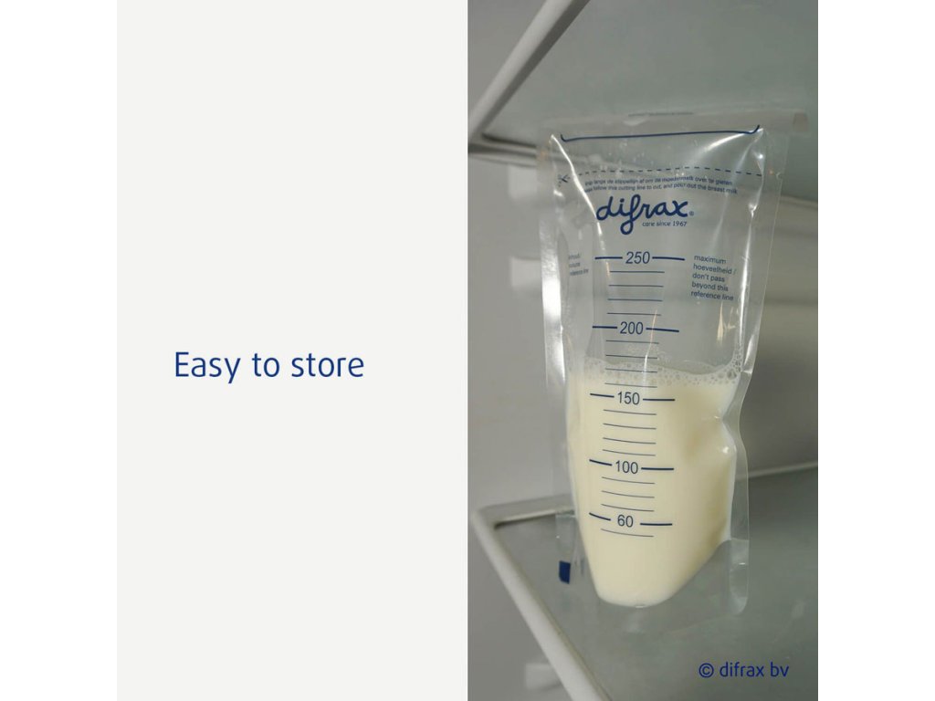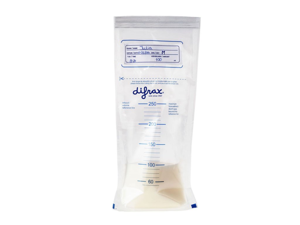 Dno sáčku je navrženo tak, aby bylo sáčky možné skladovat i ve vzpřímené poloze. Díky dvojitému neprodyšnému zip-zavírání nevyteče ze sáčku ani kapka a mléko může být skladováno delší dobu.