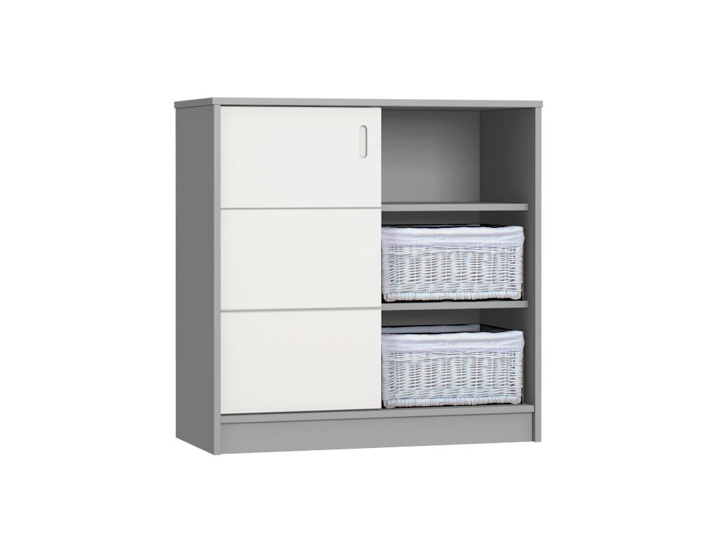 Leskle lakovaná posuvná dvířka, 3 poličky , dva proutěné košíky s podšívkou (nejsou součástí) možnost přikoupení cena za kus 1590,-Kč. Komoda poskytuje dostatek prostoru na vše potřebné bez toho, že by vyžadovala prostor na otevírání dvířek. Komoda je optimálně vysoká pro pohodlné přebalování. V případě využití na přebalování a další péči o dítě, je nezbytné dokoupit přebalovací nástavec zvětšující horní plochu komody a navíc vybavený bočními bezpečnostními zarážkami, které zabraňují posunutí samostatně dokupované přebalovací podložky mimo komodu.