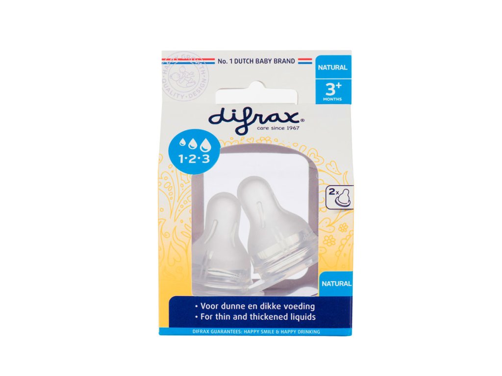 Difrax 1-2-3 Variflow savička se postará díky přirozenému tvaru imitující mateřský prs o to, že miminko si na krmení z lahvičky zvykne ve velice krátkém časovém intervalu. Savička má velice jemný a měkký povrch a je vyrobena z bezpečného vysoce kvalitního silikonu bez použití BPA. Savička je designována tak, aby simulací prsu stimulovala sací instinkt miminka - savička je tedy ideální volbou pro kombinované krmení - kojení a z lahvičky. Průtok výživy lze korigovat třema stupni systému Variflow, které obsáhnou potravu od té nejtekutější k husté jako je kašička apod. Vybraný stupěň průtoku je indikován vroubky po stranách savičky.